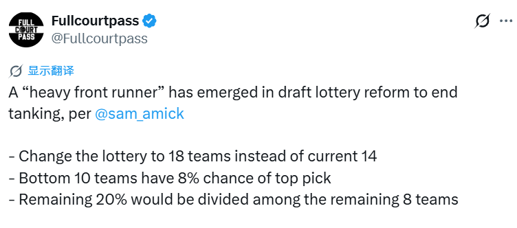 开云体育app-曝反摆烂方案基本敲定!抽签扩至18队 最差10队状元签概率均为8%